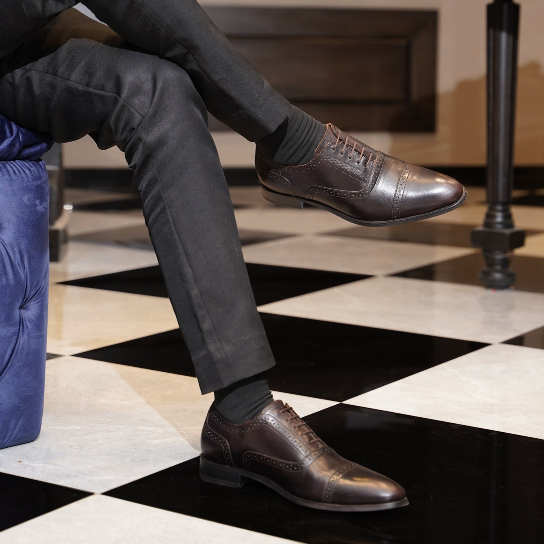 Richmond - Men's Dark Brown Calf Leather Oxford Shoe feature a closed lacing system and dainite sole. A dark brown calf leather oxford shoe with a dainite sole is a combination of style and refinement. The dainite sole is known for its durability and grip, making it ideal for all weather conditions. The dark brown color provides a classic and versatile look. These oxfords are suitable for both formal occasions and every day wear.