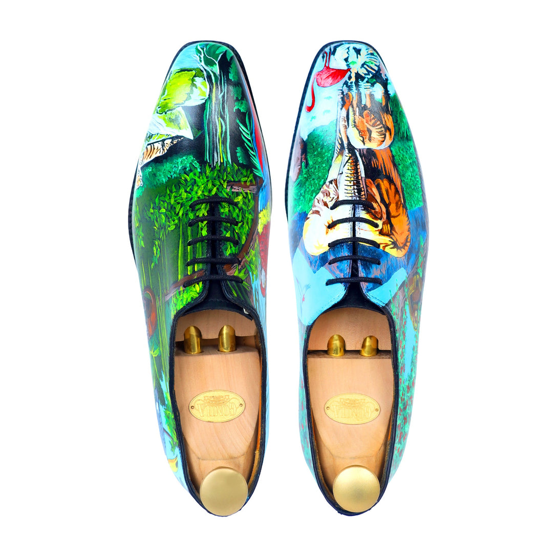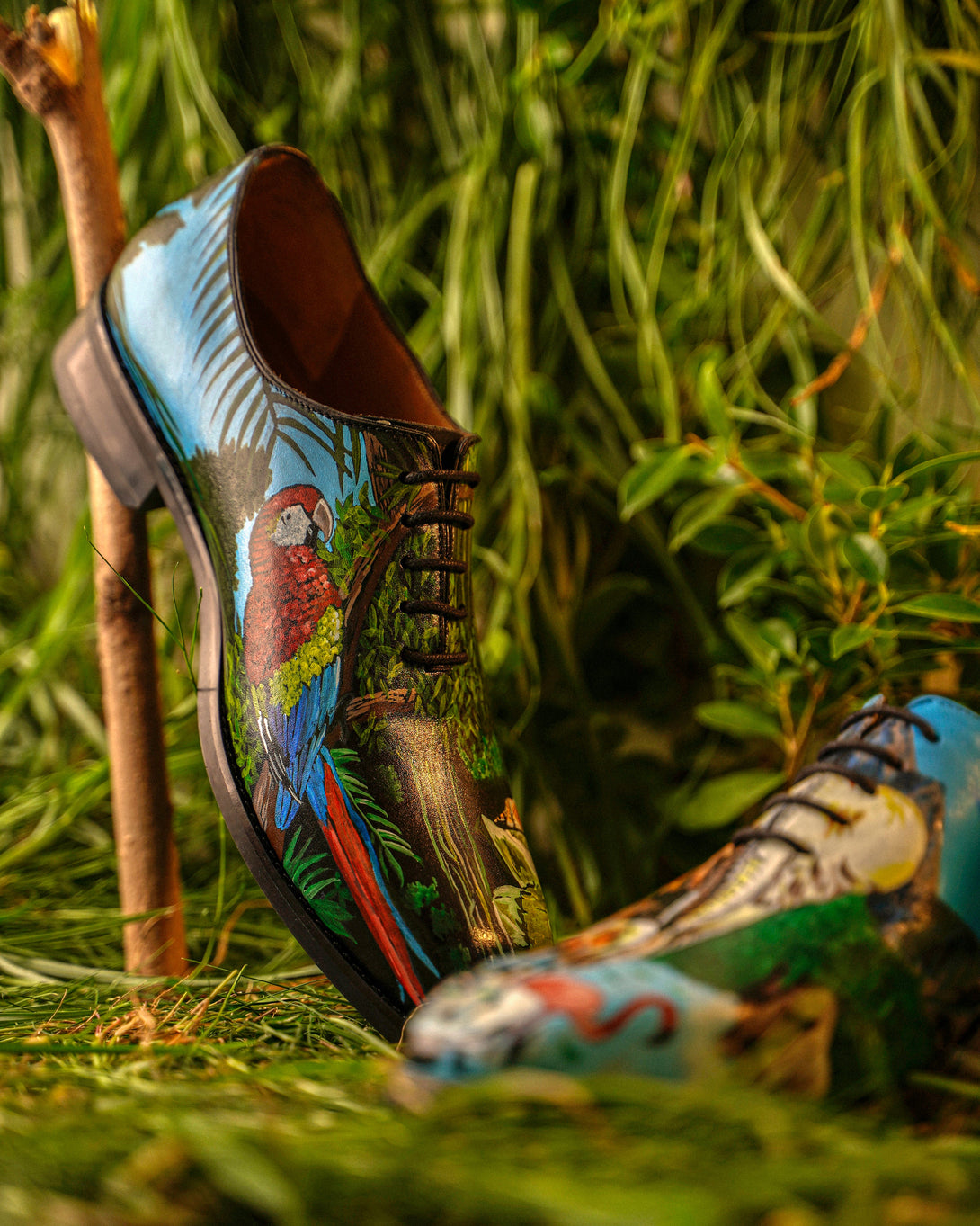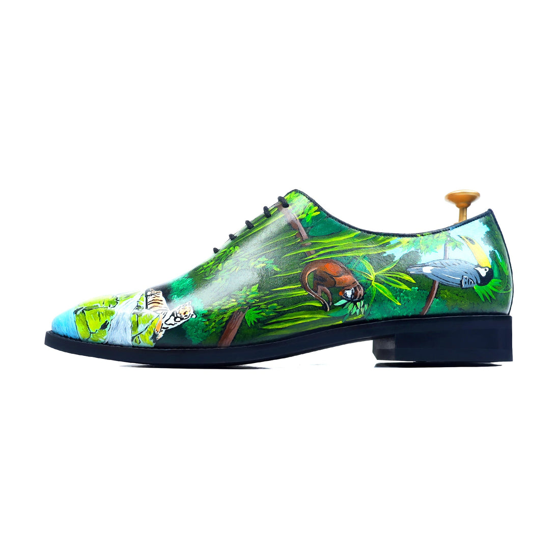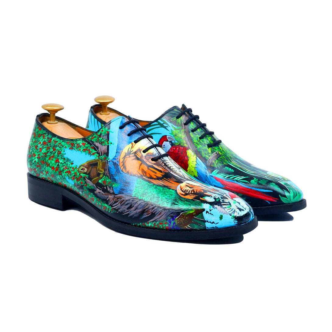 Immerse yourself in the essence of untamed wilderness with the Safari Wholecut, a statement of luxury inspired by the raw beauty of the jungle. Each pair is meticulously crafted from premium calf leather, showcasing nature’s vibrance—lush greenery, exotic wildlife, and vivid tones—brought to life through masterful hand-painting.