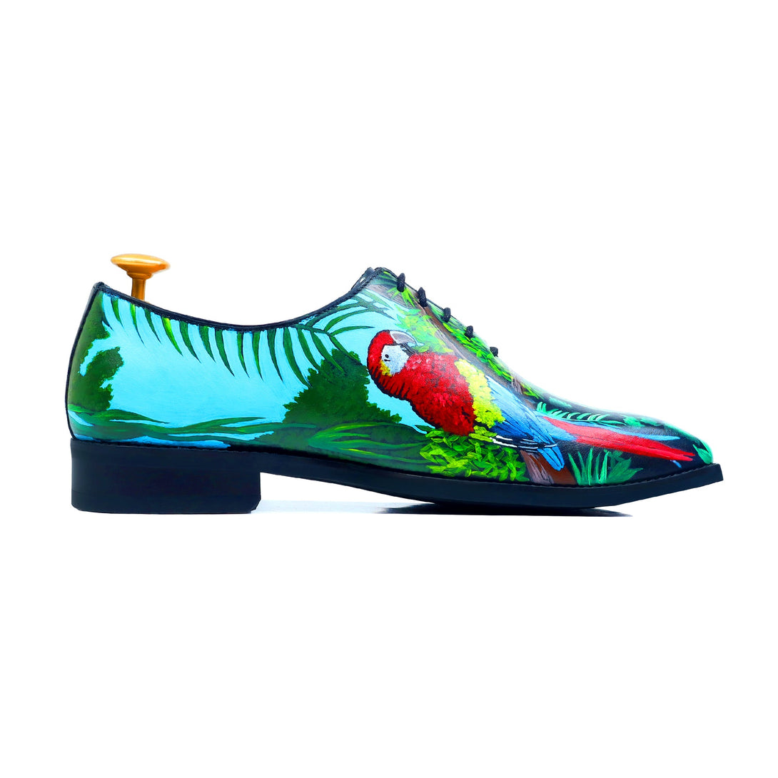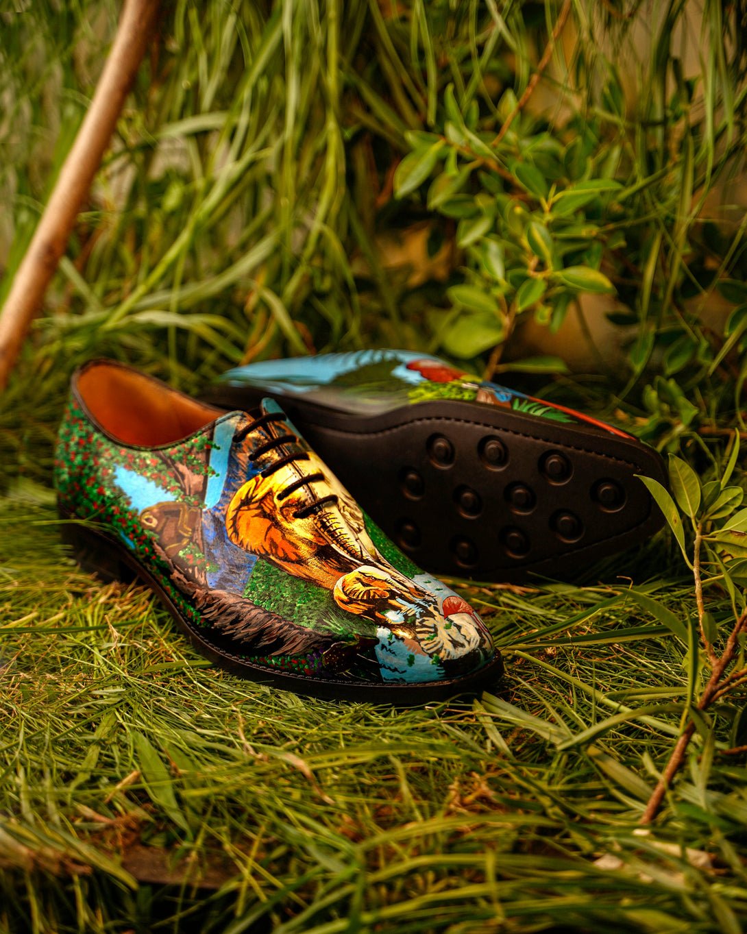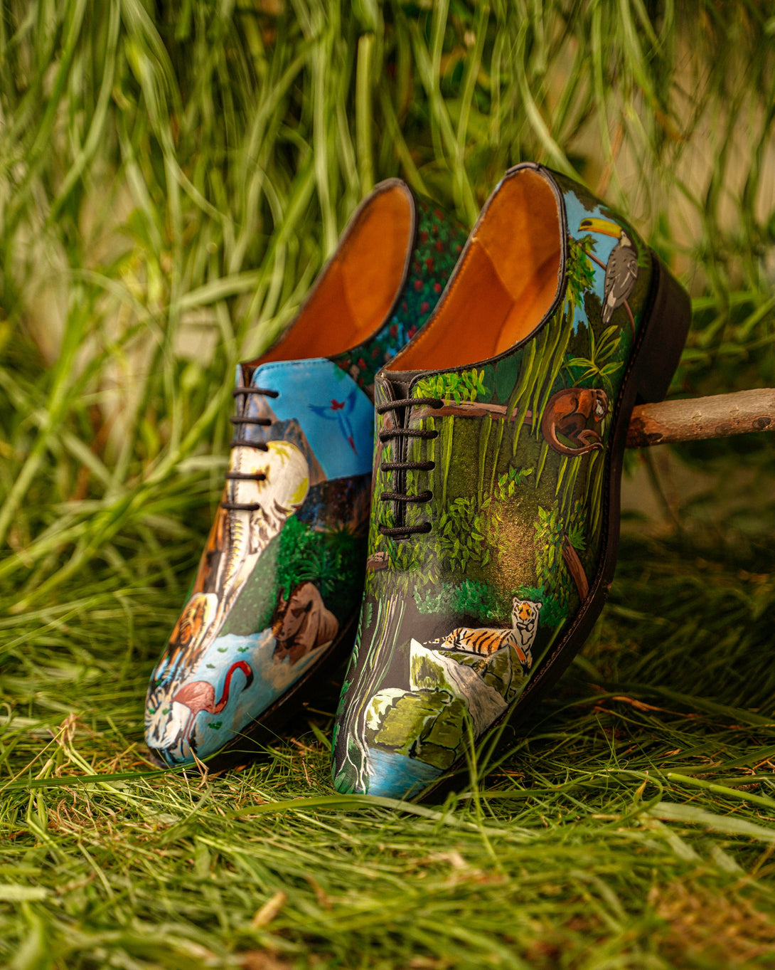 Immerse yourself in the essence of untamed wilderness with the Safari Wholecut, a statement of luxury inspired by the raw beauty of the jungle. Each pair is meticulously crafted from premium calf leather, showcasing nature’s vibrance—lush greenery, exotic wildlife, and vivid tones—brought to life through masterful hand-painting.