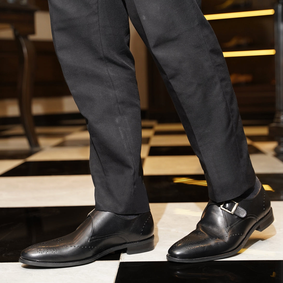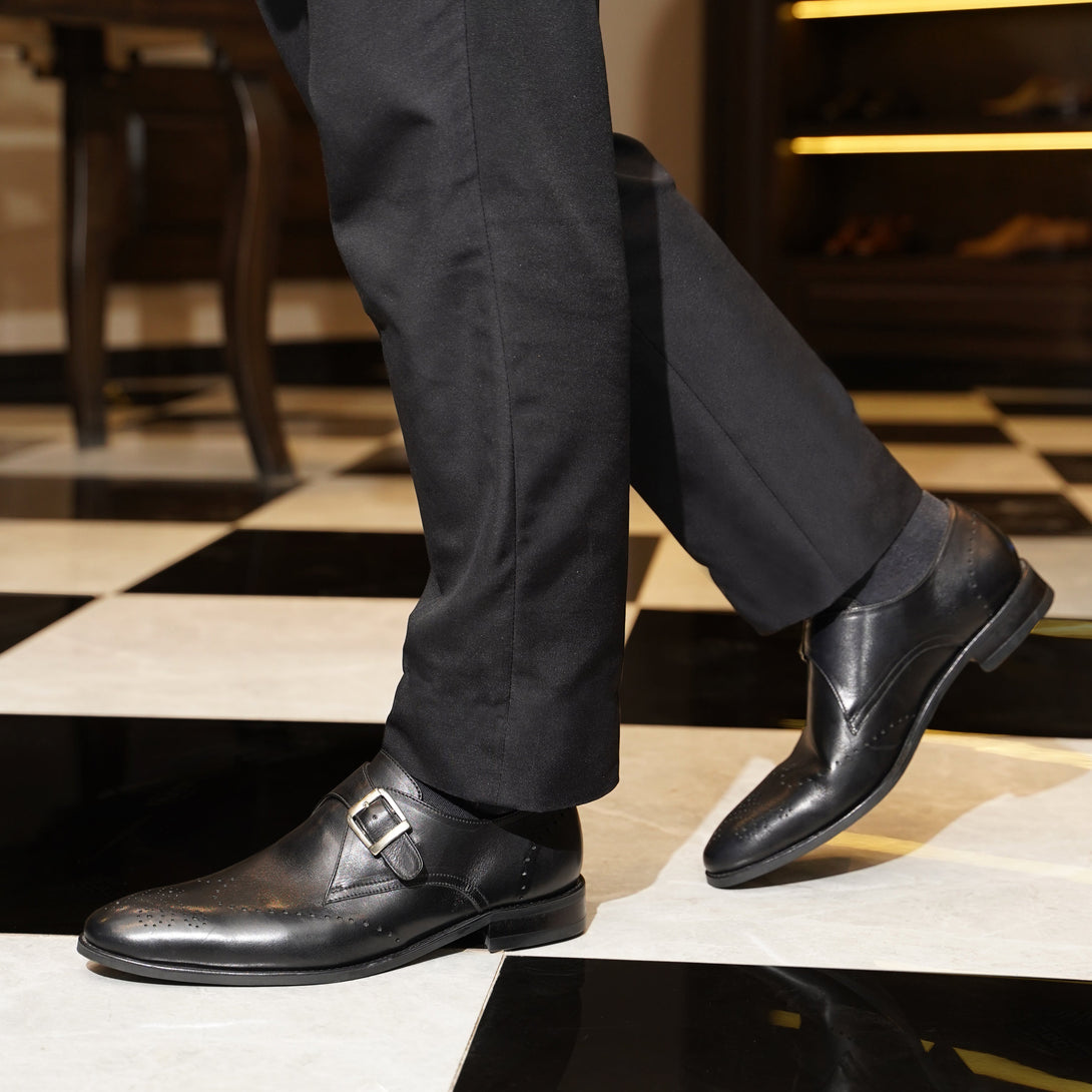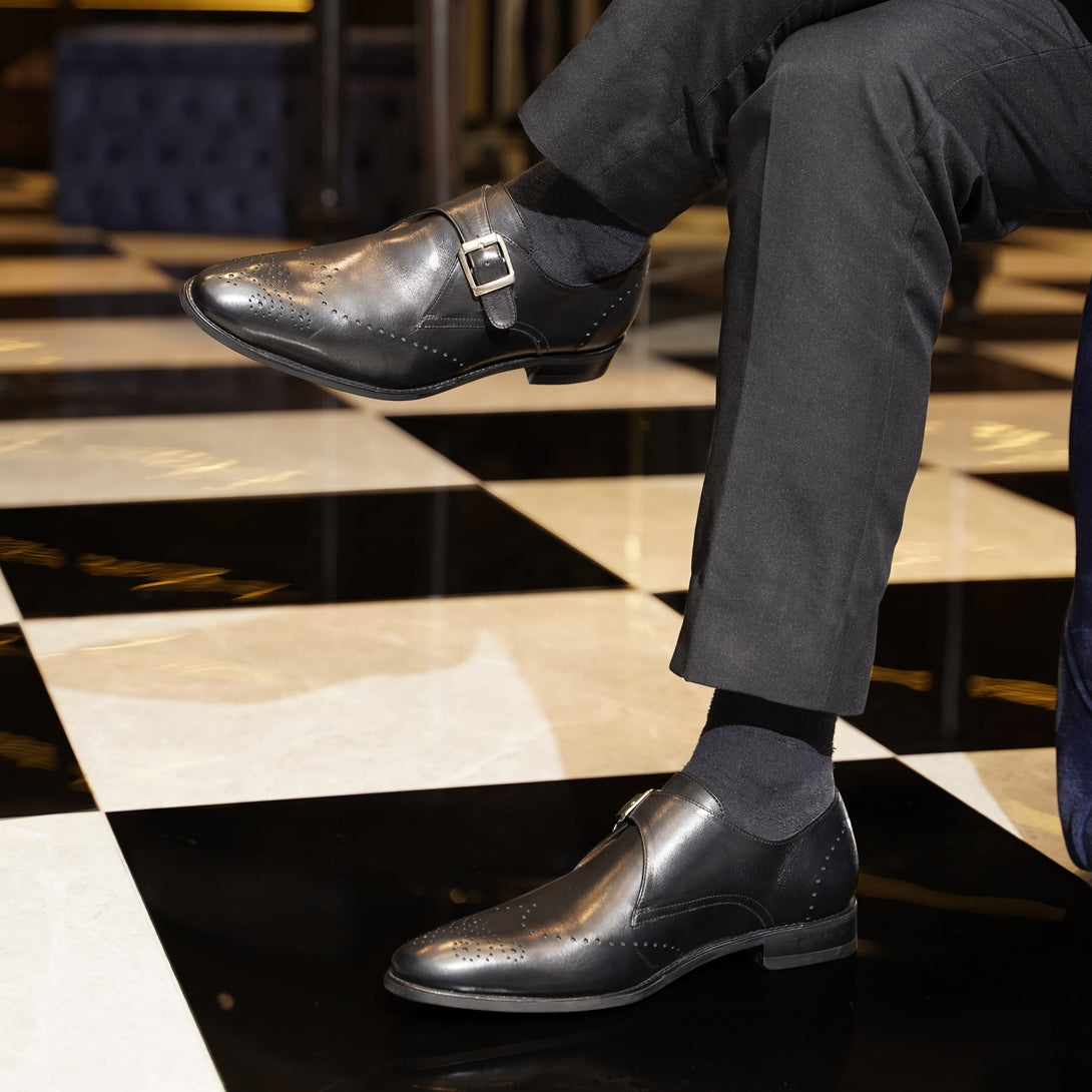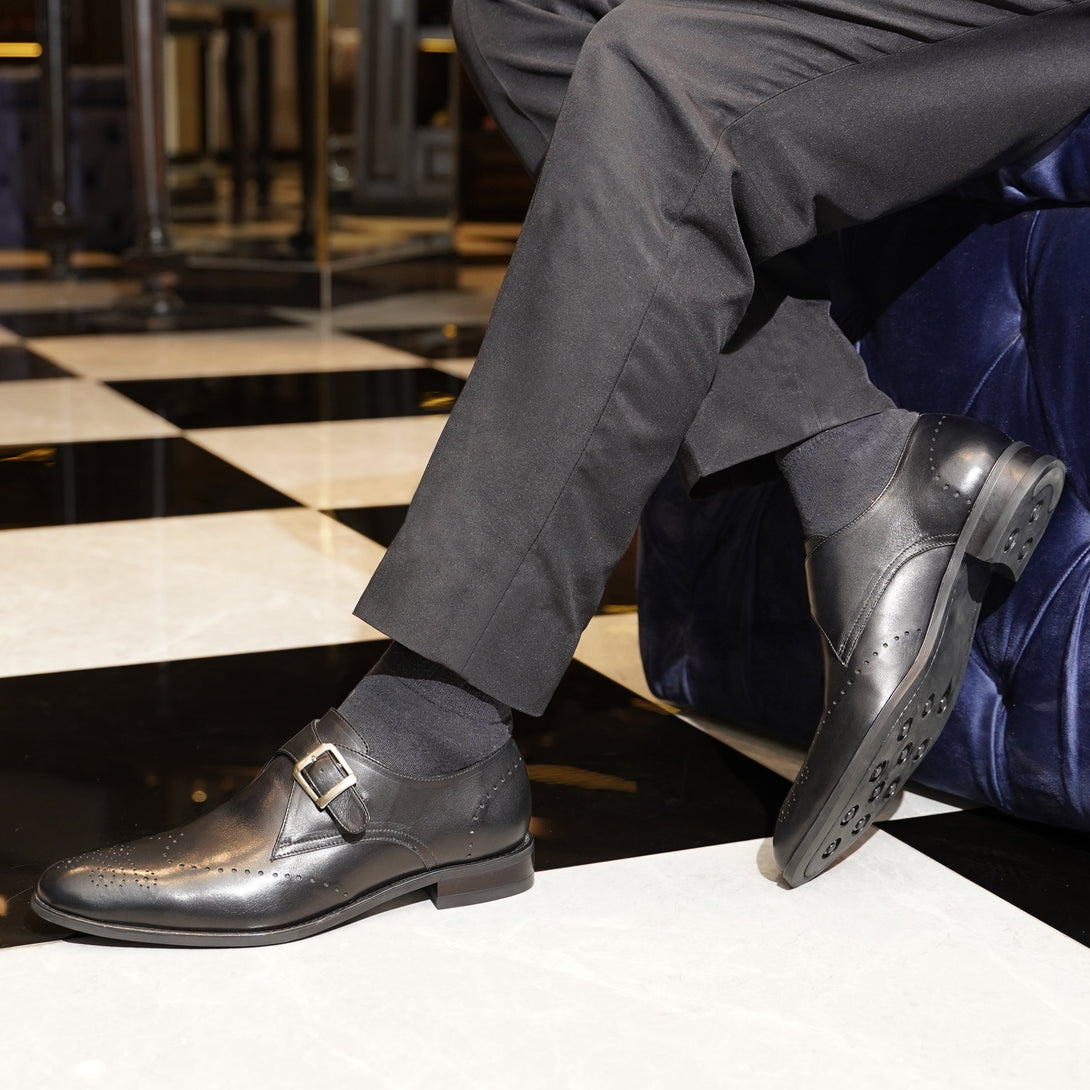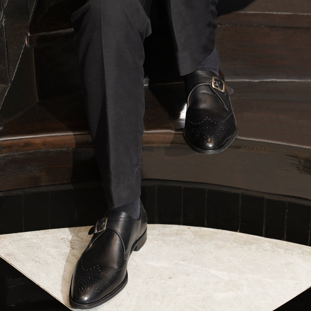 Brecon - Men's Black Calf Leather Single Monkstrap is a black Leather monkstrap shoe with a leather rubber sole is a combination of style and refinement. Featuring a timeless design with a single strap and buckle across the front. This versatile footwear exudes sophistication and make it perfect for both formal occasions and every day wear.