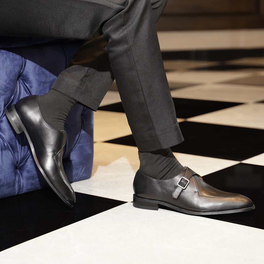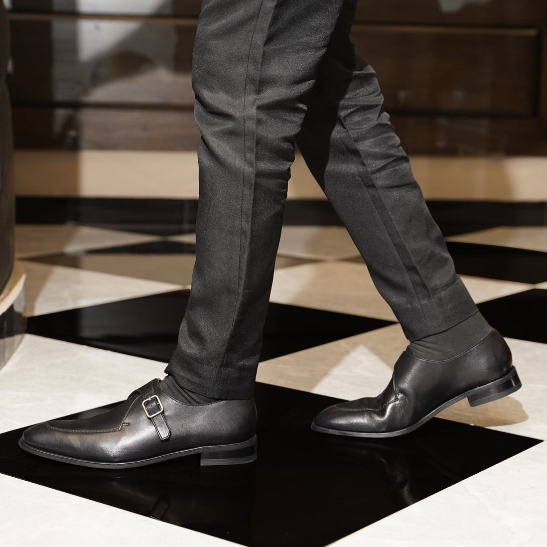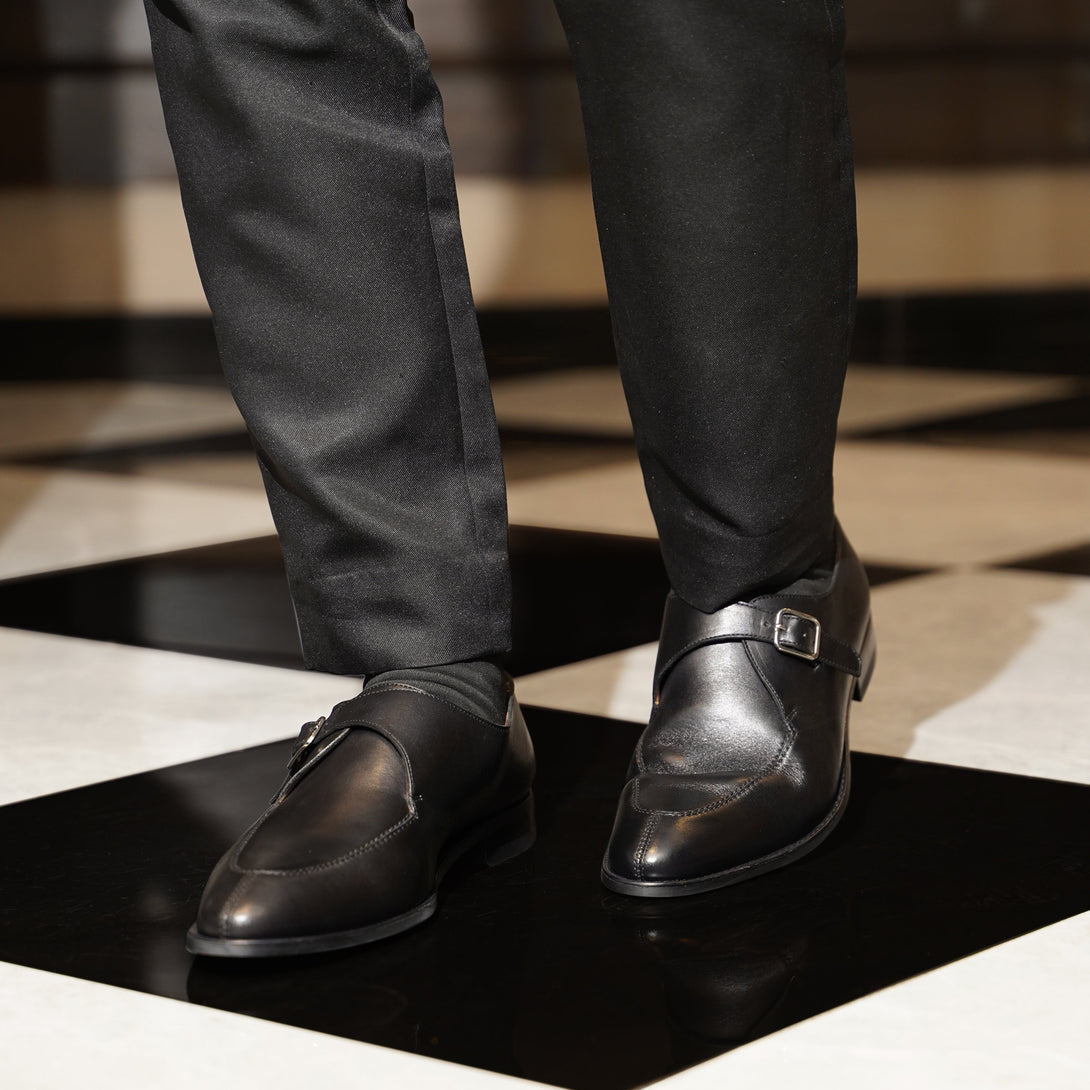 Tavistock - Men's Black Calf Leather Single Monkstrap Shoe is a black calf Leather monkstrap shoe with a leather rubber sole is a combination of style and refinement. Featuring a timeless design with two straps and buckles across the front. This versatile footwear exudes sophistication and make it perfect for both formal occasions and every day wear.