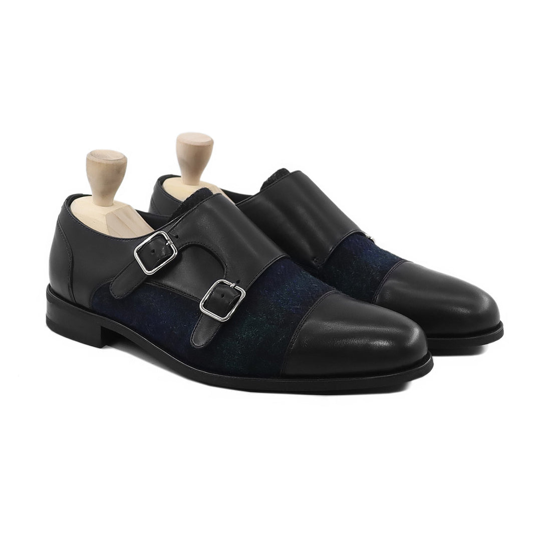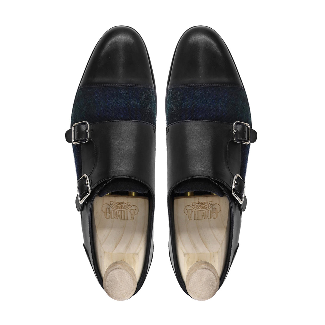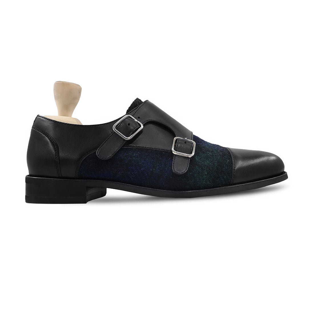 Tomio - Men's Black Calf Leather and Harris Tweed Double Monkstrap